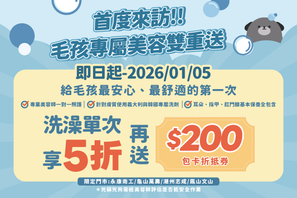 - 【新客限定】初次見面雙重禮!洗澡體驗 5 折,包卡再折 $200